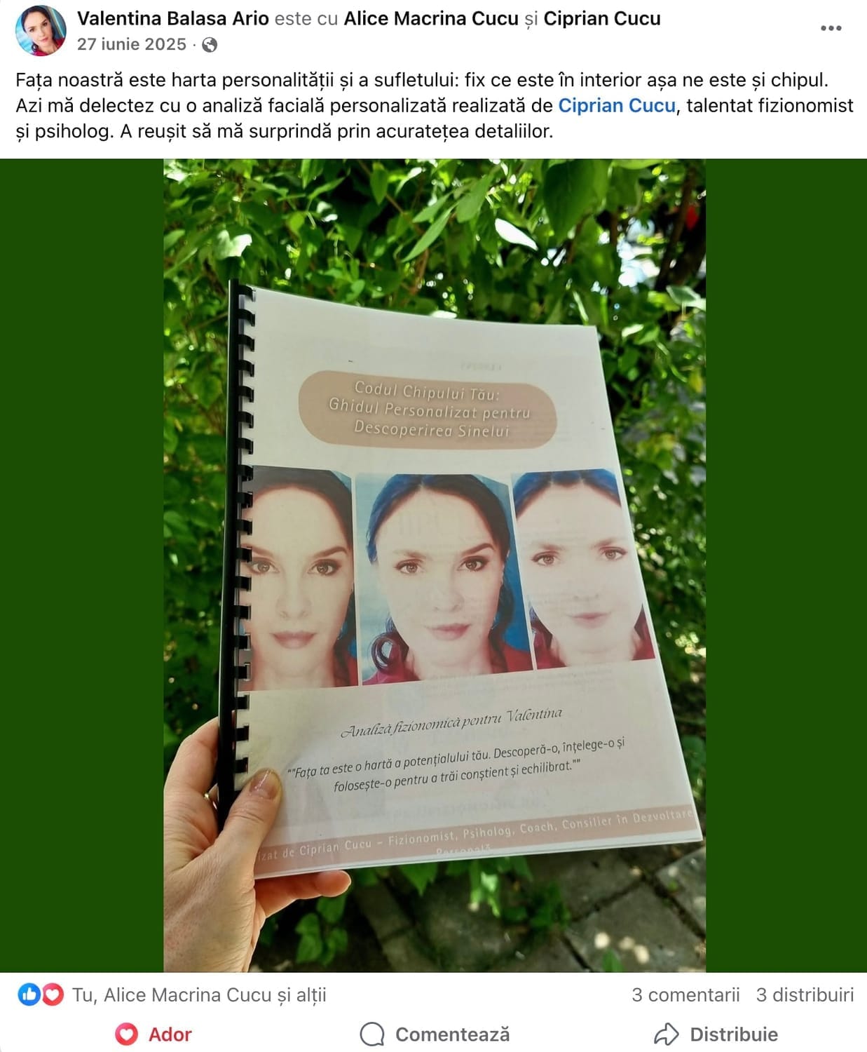 “Să te ajut să vezi clar ceea ce până acum îți scăpa – să înțelegi cine ești, ce te motivează și ce te blochează. Prin analiza trăsăturilor tale faciale, îți ofer uneltele necesare pentru a lua decizii mai bune, pentru a construi relații autentice și pentru a-ți găsi drumul în viață.